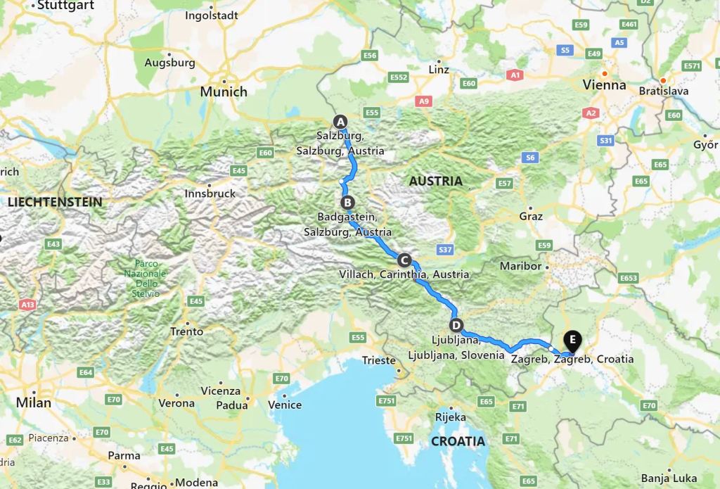 WITH HER HUSBAND Rebecca West travels by train from Salzburg, Austria, to Zagreb, the capital of Croatia. They climb to Badgastein and the Hohe Tauern railway tunnel built in 1909 (bearing the name of the emperor Franz Joseph at its entrance) to Villach, high in the Austrian alps. They traverse the Wörther See to Ljubljana, Slovenia, and then on to Zagreb. West does not visit Slovenia and fails to mention Ljubljana at all in the text, marking that station only on the map on the endpaper of the 1st edition.