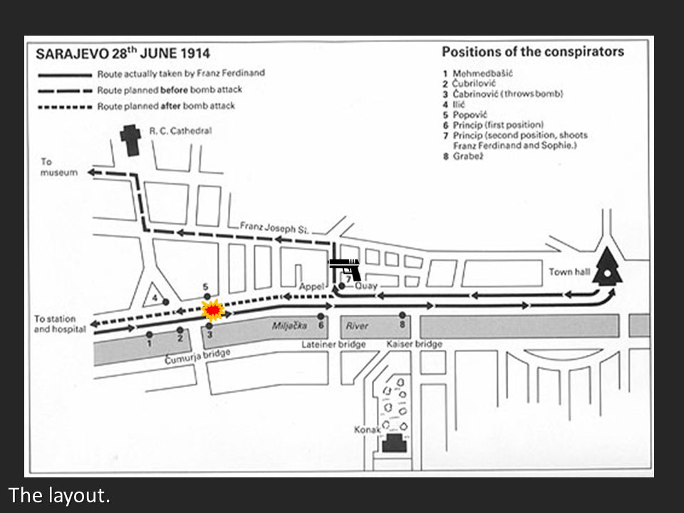 What brought these two parties together at that fateful moment would be considered an absurd farce if it had not resulted in such calamity. Reports of plots and intelligence were ignored. The archduke’s ruler-straight motorcade route and lax security are a remedial course for bodyguards in how to get your principal killed (see below). The motorcade drove down the left bank of the Miljacka, which alone drastically limited escape routes as a right turn would end up in the river. A failed attempt by Nedeljko Čabrinović to explode a bomb under the motorcade did not alter the route in the slightest. It continued to the City Hall, where Franz Ferdinand held a brief, strange, and strained audience, complaining about his explosive reception in the city. Despite this, he boarded his open car, which returned the way it came, that is, straight back into the kill zone.