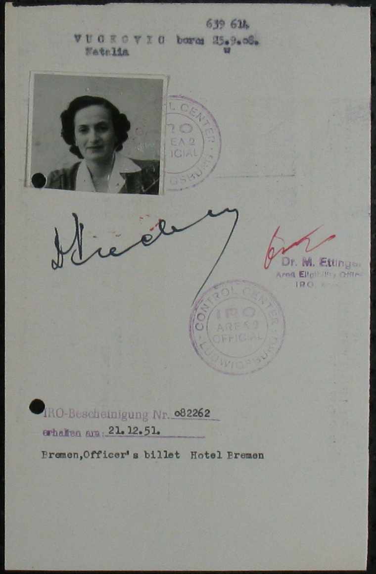 This is a photograph of Nina in 1951 taken for her identification card issued by the International Refugee Organization (IRO) in Bremen, West Germany. The IRO was the precursor organization for what would become the United Nations High Commission for Refugees. To my knowledge this photograph is previously unpublished.